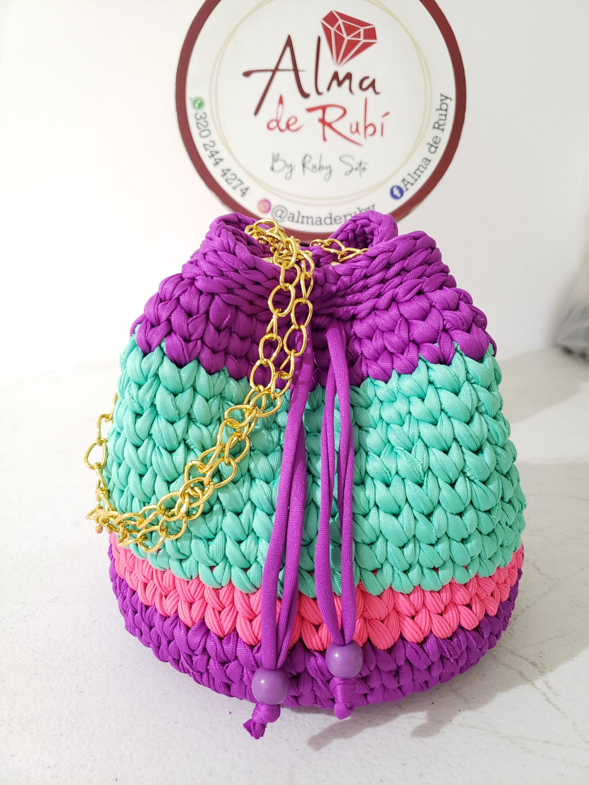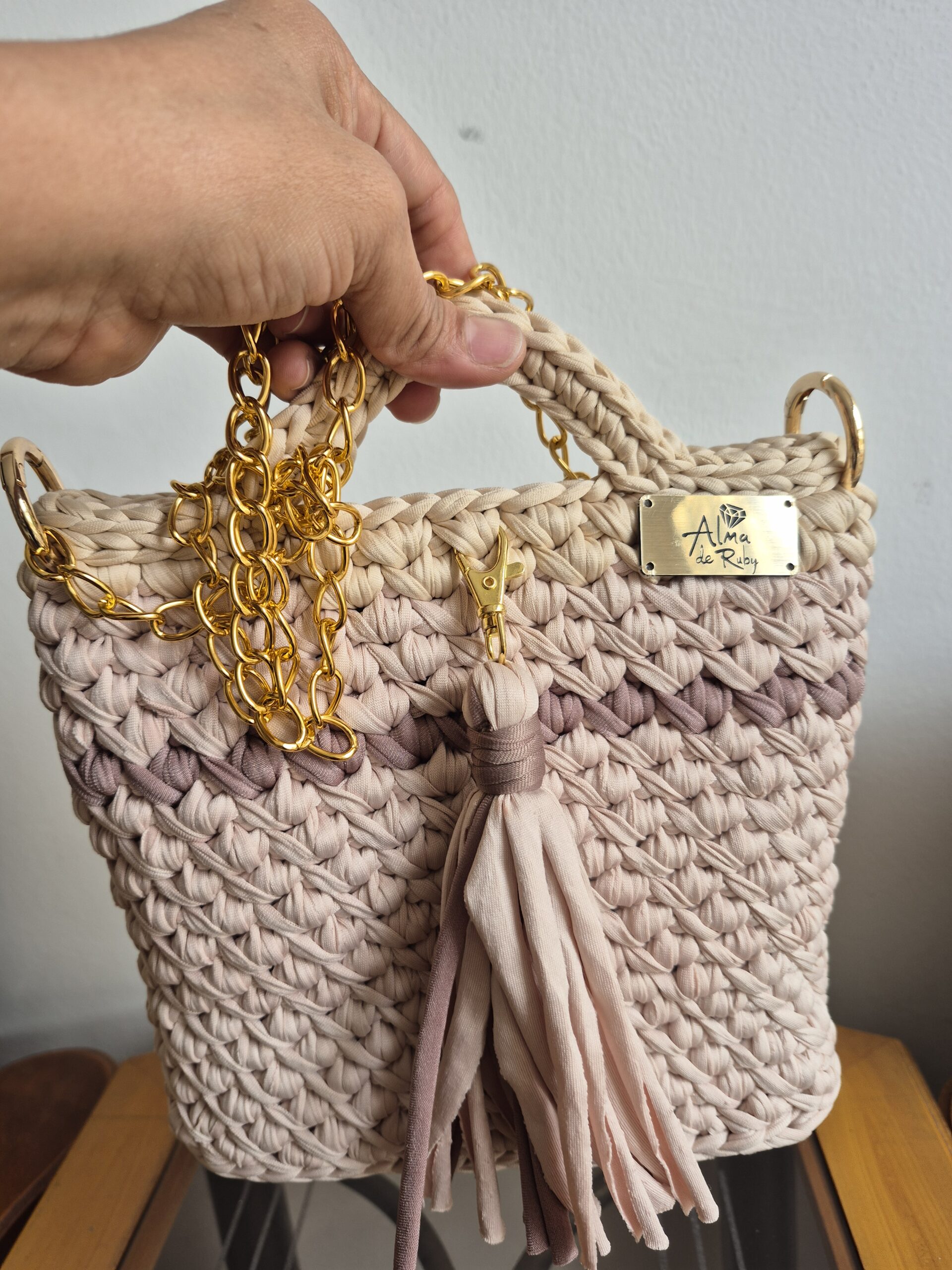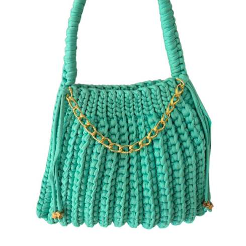 Bolso Tejido en trapillo elástico y resistente en técnica crochet. Con cierre de imán para su seguridad y cadena y accesorios dorados de excelente calidad que realizan su diseño.